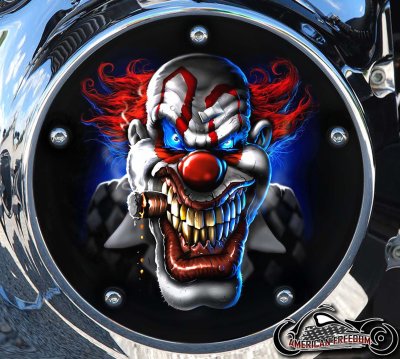 Custom Handmade Harley Davidson Derby Cover – Durable Aluminum, Hard-Coated, Evil Cigar Clown Design – USA-Made, Glossy & Matte Finish Options