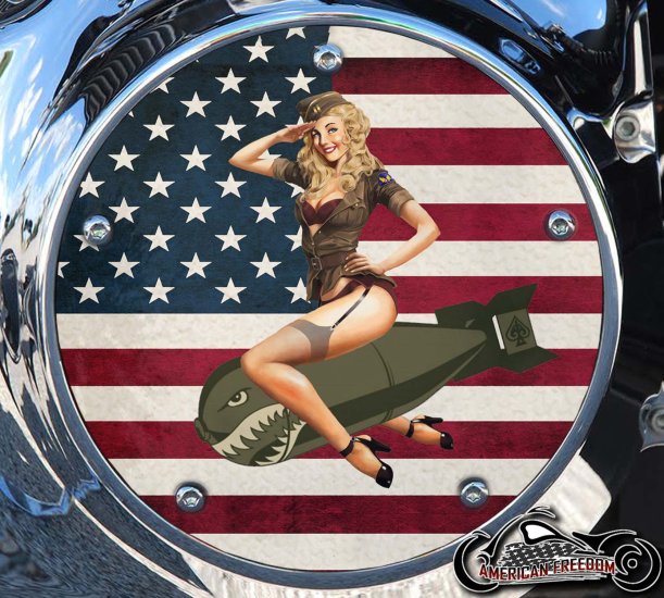 Add a touch of retro charm and patriotic flair to your Harley with this custom handmade Harley Davidson derby cover. Featuring a beautiful blonde pin-up woman riding on an aerial bomb, set against a waving American flag, this design captures the spirit of vintage Americana with bold and striking artistry.