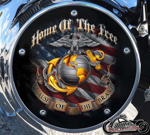 Show your respect for the United States Marine Corps with this custom-made Harley Davidson derby cover. Featuring the iconic Marine Corps Eagle, Globe, and Anchor emblem, this tribute design also includes the powerful phrases "Home of the Free" and "Because of the Brave". With a distressed American flag waving in the background, this derby cover is a bold and patriotic addition to your Harley Davidson.