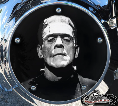 Transform your Harley Davidson into a bold statement of individuality with this custom handmade derby cover. Featuring an iconic black and white portrait of Frankenstein, this durable aluminum cover is crafted with precision and designed to turn heads. Made in the USA by skilled artisans, it’s the perfect blend of artistry and performance.
