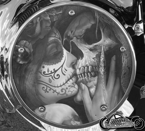 Elevate the look of your Harley Davidson with the Death Kiss BW handmade Derby Cover. Each one of these custom covers is crafted to order, giving you a unique and personalized touch for your motorcycle. With a production time of approximately 3 to 5 business days, you won't have to wait long to receive your new derby cover. Designed to fit Softail, Dyna, Touring, Trike and Sportster models, this high-quality accessory is a must-have for any rider looking to add some extra style to their bike. Upgrade your Harley with the Death Kiss BW derby cover and stand out on the road.