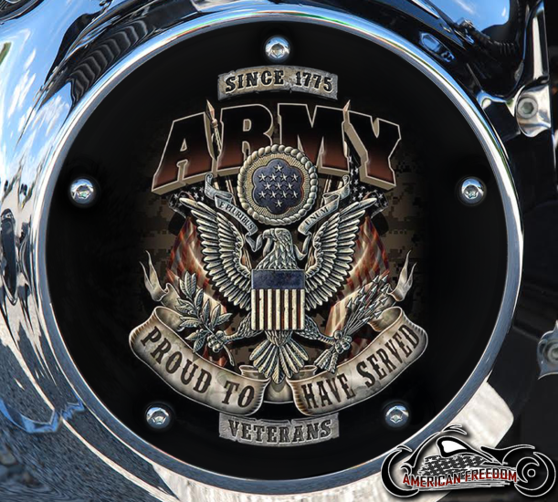 Show your respect and pride for the U.S. Army veterans with this custom-made Harley Davidson derby cover. Featuring a bold bald eagle emblem, this tribute design highlights the strength and courage of our veterans. The words "Proud to Have Served" are displayed on a banner below the eagle, making this a meaningful and patriotic addition to your bike.