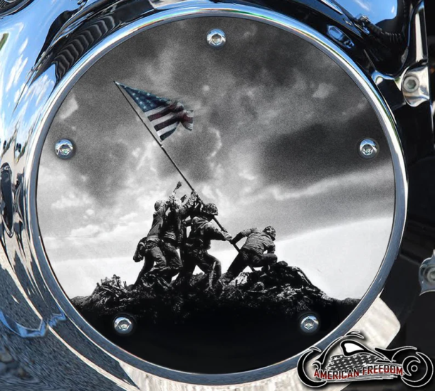 Honor the bravery and sacrifice of our U.S. veterans with this custom handmade Harley Davidson derby cover, featuring a memorial tribute design of the infamous Iwo Jima flag-raising. Made with precision craftsmanship, this derby cover is built with a durable aluminum hard coat and is available in multiple sizes to fit various Harley Davidson models.