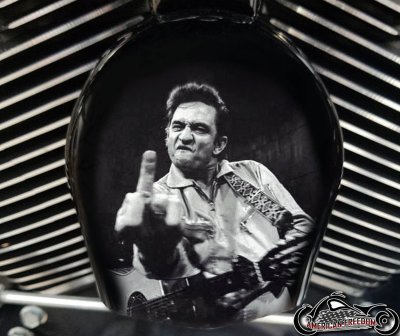- The Johnny Cash Folsom Prison design, showcasing his legendary performance with attitude by flipping the bird, adds a unique and rebellious touch to your Harley.