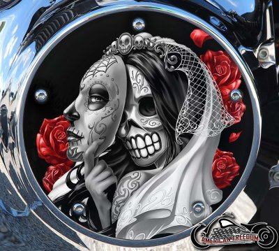Elevate the look of your Harley Davidson with the Day Of The Dead Mask handmade Derby Cover. Each one of these custom covers is crafted to order, giving you a unique and personalized touch for your motorcycle. With a production time of approximately 3 to 5 business days, you won't have to wait long to receive your new derby cover. Designed to fit Softail, Dyna, Touring, Trike and Sportster models, this high-quality accessory is a must-have for any rider looking to add some extra style to their bike. Upgrade your Harley with the Day Of The Dead Mask derby cover and stand out on the road.