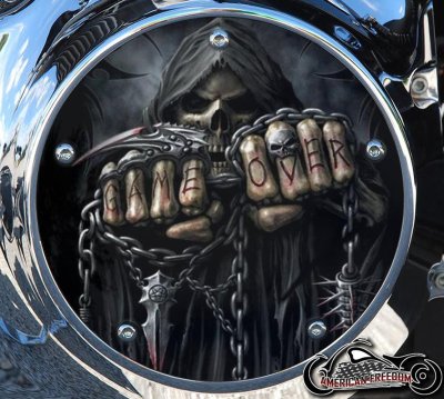 Make your Harley Davidson stand out with this custom handmade derby cover featuring an intense graphic of a cloaked Reaper. With its bone fists directed outward and the bold “Game Over” message on each finger, this design is perfect for riders who embrace a fearless, bold attitude.